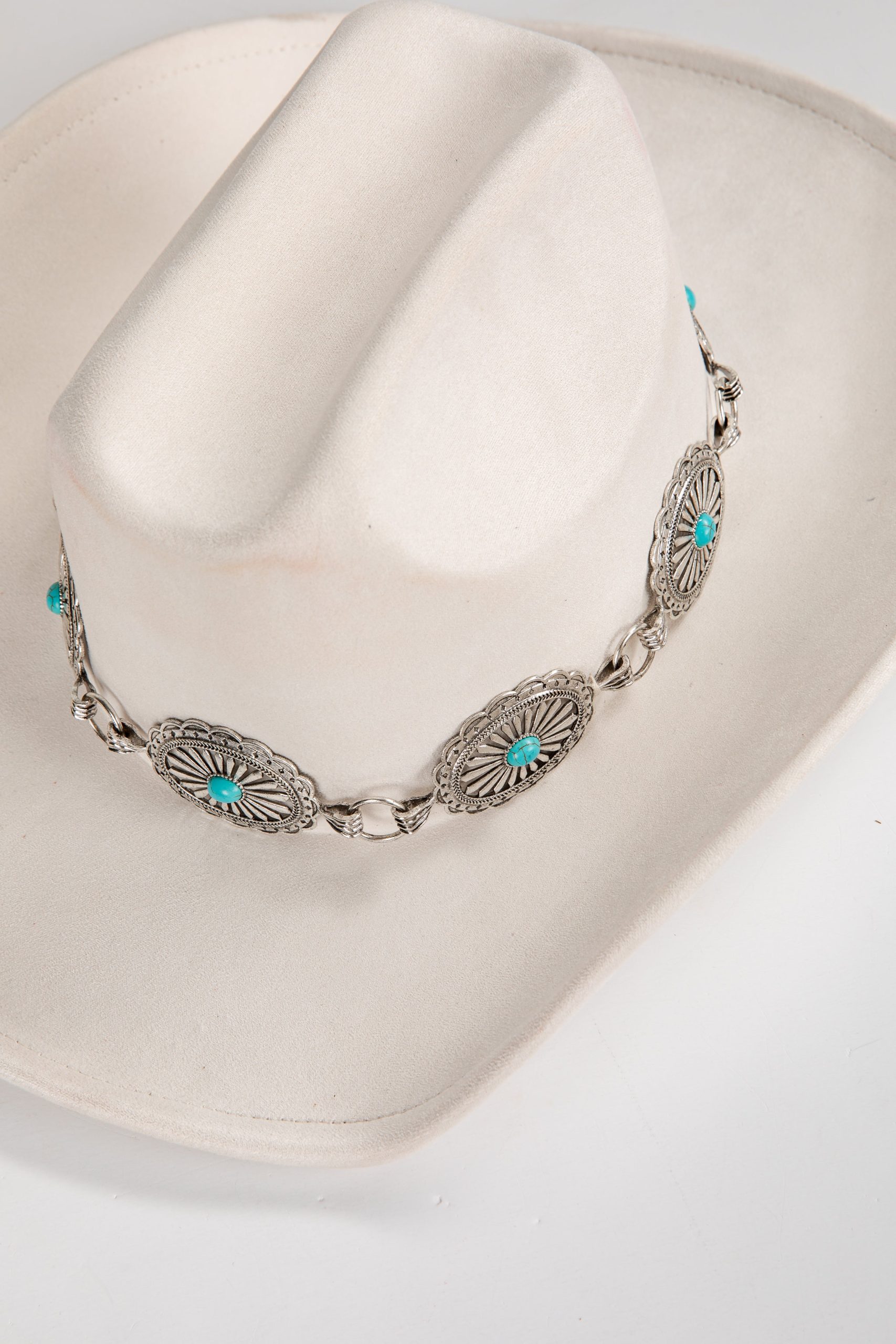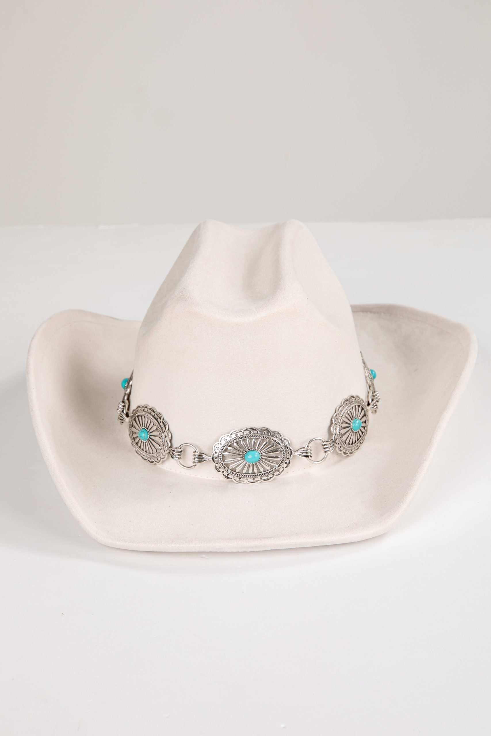 We’re ready to giddy-up and get glamorous with the Galloping Beauty Ivory Fedora Western Hat! This trendy hat has a wide curved brim, ultra soft and structured suede-like material with a fedora design and a silver chain band. The luxe design can be paired with maxi dresses and block heels or dressed casual with flare jeans and a graphic tee! Soft Faux Suede Material Wide Curved Brim Structured Fit Fedora Style Silver Chain Band 90% Polyester, 10% AlloyOne Size | Brim Diameter Approx. 15.5″ | Head Diameter Approx. 8” | Crown Approx. 7″ | Brim Length 3.75”